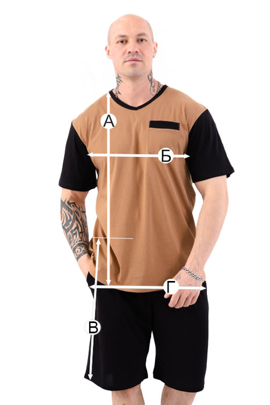 Піжама для чоловіків з однотонного куліру. Модель складається з футболки та шортів. Футболка з округлою горловиною, короткими рукавами, спереду є кишеня. Шорти прямі на широкій гумці, вільного крою. Модель підійде як для сну, так і в якості домашнього одягу. Полотно натуральне, тому при пранні може давати невелику усадку.