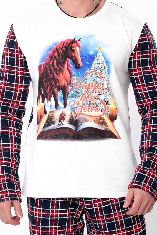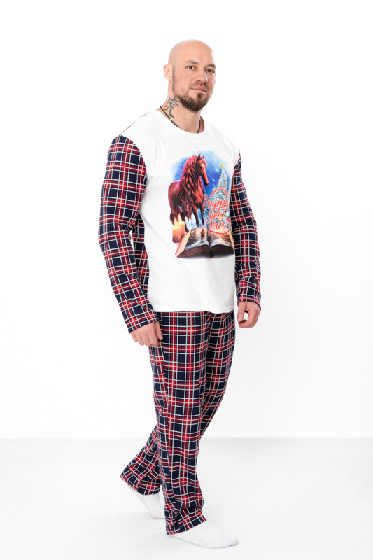 Чоловіча піжама ТМ "Трикотажний Край", виконана з м'якого однотонного начосу. У наборі: кофта, декорована новорічним принтом, та зручні штани на резинці. Якісний легкий матеріал забезпечить максимально комфортний і приємний сон.