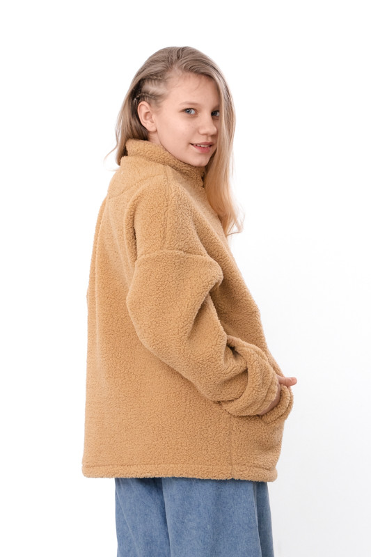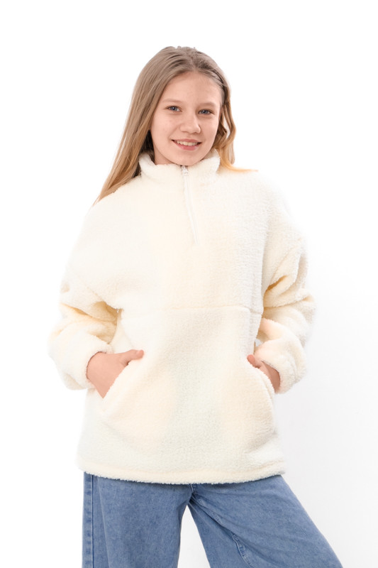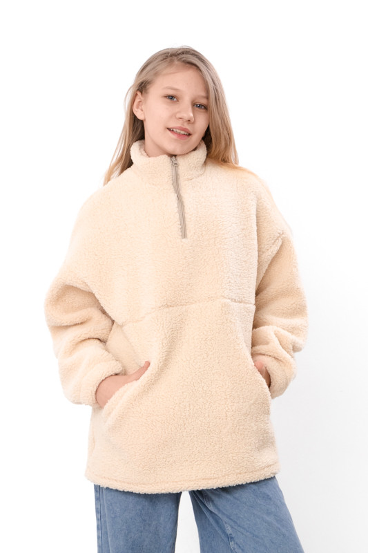 Модель має продуманий дизайн: вільний крій, високий комір-стійку на блискавці та зручну кишеню кенгуру. Така форма не сковує рухів, дозволяє активно проводити час і водночас виглядати стильно. Завдяки об’ємній фактурі хутра джемпер виглядає дуже затишно та трендово — саме так, як любить сучасна молодь.