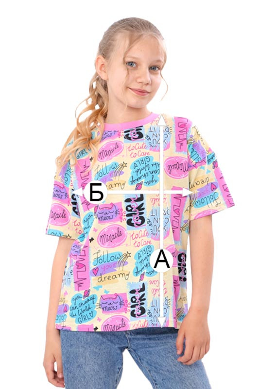Футболка прямого крою з короткими рукавами та округлою горловиною забезпечує комфорт та стильний вигляд. Виготовлена з високоякісного принтованого куліру (100% бавовна), вона м'яка на дотик і чудово підходить для повсякденного носіння. Ця підліткова футболка для дівчинки стане чудовим доповненням до будь-якого гардеробу. Принтований кулір додає яскравості та оригінальності виробу, забезпечуючи комфорт під час носіння.