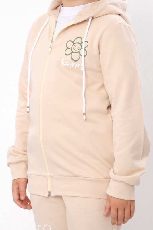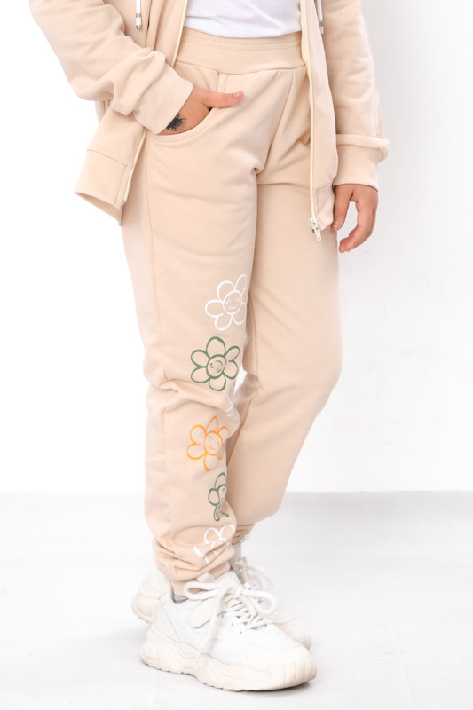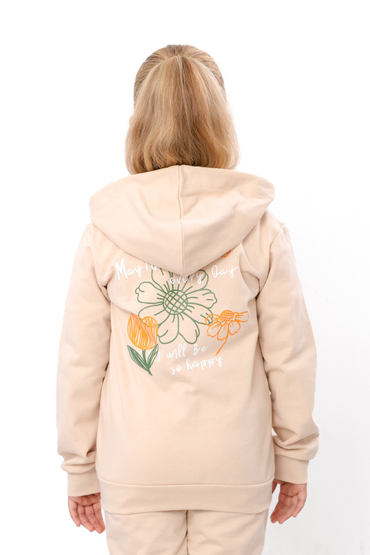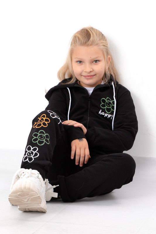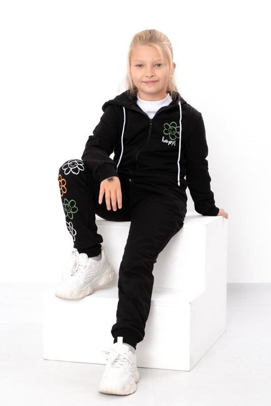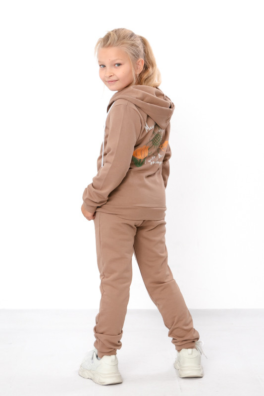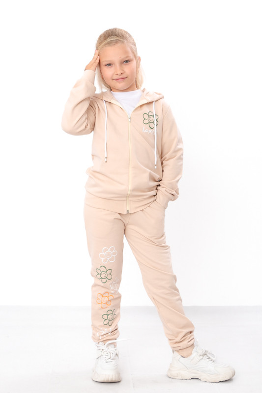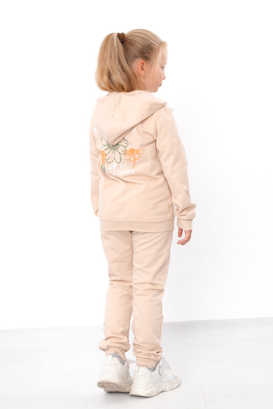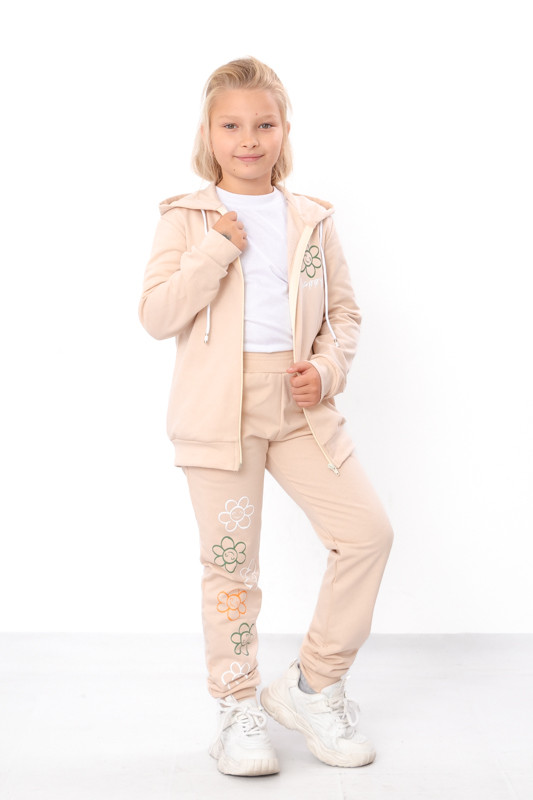 У дитячий спортивний костюм входять: кофта та штани. Модель виконана з однотонного начосу. Полотно сідає при пранні по довжині на 1-2 см. Рекомендується прати при температурі не більше 30 градусів. Кофта з капюшоном, на блискавці, доповнена декоративним шнурком. Штани на резинці, що добре тягнеться, також є кишені для зручності. На рукавах, знизу кофти і штанів стрейчеві манжети. Костюм прикрашений барвистим і якісним накатом. Модель ідеально підійде для прогулянок або занять спортом.