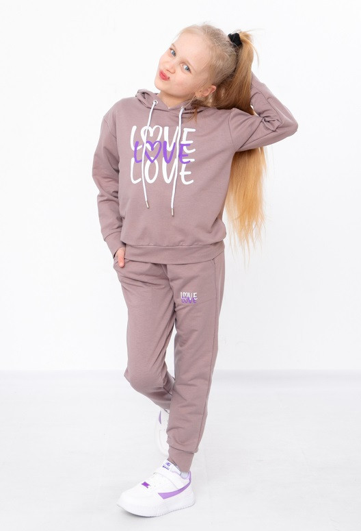 Костюм для дівчаток з однотонної двонитки, складається з джемпера та штанів. Джемпер з довгими рукавами та капюшоном, на рукавах та по низу є широкі еластичні манжети. Штани з кишенями, пояс на широкій резинці. Костюм прикрашений стильним написом. Полотно гарної якості. Тому, при правильному догляді, виріб можна буде носити не один сезон. Може давати усадку після прання.