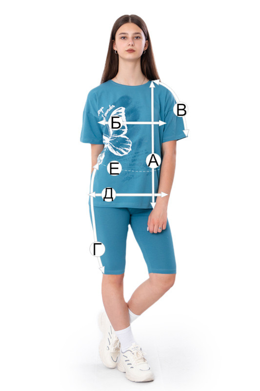 Легкий літній комплект для дівчаток-підлітків з еластичного трикотажного полотна фулікра, складається з вільної футболки з округлою горловиною і велосипедок. Футболка має короткі рукава зі спущеною лінією плеча та округлу горловину. Спереду нанесений невеликий малюнок в якості декору. Велосипедки на резинці. Комплект стане незамінним в гардеробі юних модниць спекотним літом, доповнити образ можна кросівками, кедами або спортивними босоніжками. Полотно відмінної якості, при правильному догляді не дає усадку, завдяки наявності еластану в складі не витягуєтьтся.