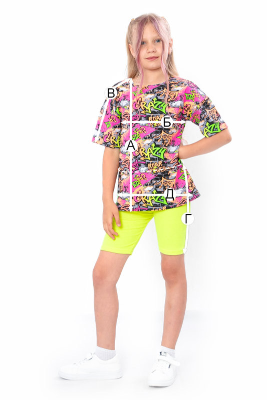 Легкий літній комплект з еластичного полотна фулікра, складається з футболки і велосипедок. Футболка має вільний крій, що не сковує рухів, округлу горловину та короткі рукава, велосипедки на резинці. Комплект стане незамінним в гардеробі дівчинки спекотним літом, доповнити образ можна кросівками, кедами або спортивними босоніжками. Полотно відмінної якості, при правильному догляді не дає усадку, завдяки наявності еластану в складі не витягується.