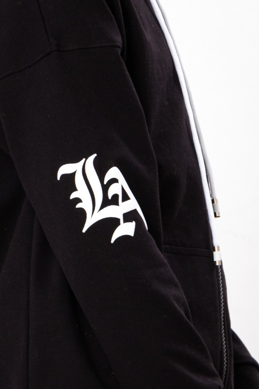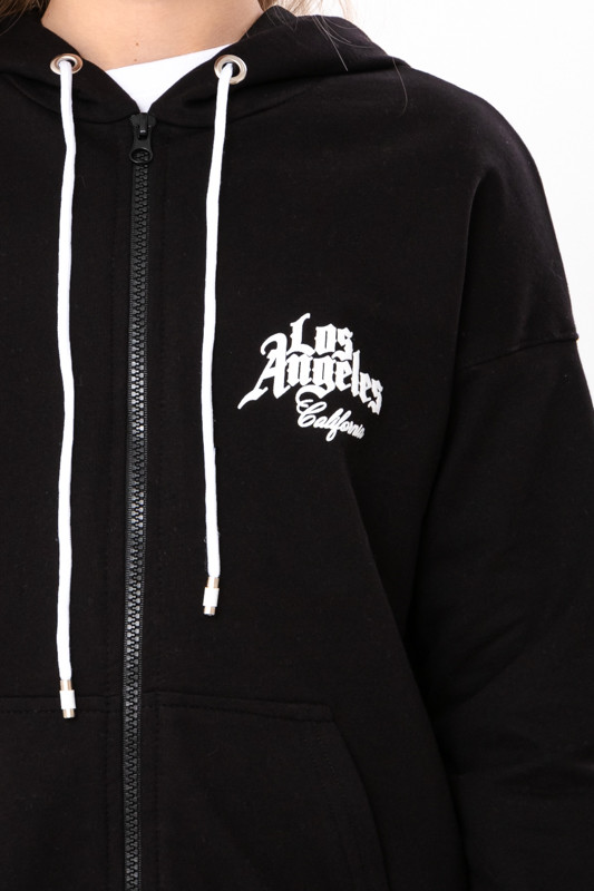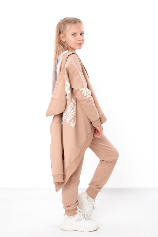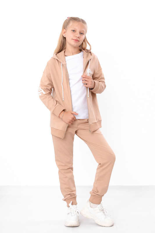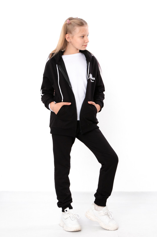 Костюм для дівчаток-підлітків з однотонної двонитки. Кофта вільного крою, з довгими рукавами на манжетах, капюшоном, застібається на блискавку. По бокам дві кишені. На спині та на рукаві нанесений невеликий малюнок в якості декору. Штани з боковими кишенями, на манжетах, поясом на широкій резинці. Костюм підходить для прогулянок, занять спортом, активного відпочинку. Доповнити образ можна кросівками, кедами. Полотно гарної якості. Тому, при правильному догляді, виріб можна буде носити не один сезон. Може давати усадку після прання.
