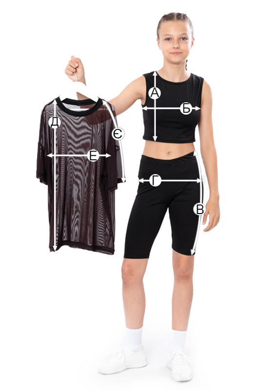 Літній комплект для дівчаток складається з велосипедок, укороченого топу з округлою горловиною та легкої футболки з трикотажної сітки. Топ і велосипедки пошиті з полотна – мікродайвінг. Полотно має високу еластичність, що забезпечує свободу рухів та комфорт під час активних занять та прогулянок. Зберігає форму після прання. Родзинкою комплекту є додаткова футболка з короткими рукавами з трикотажної сітки. Футболка надає комплекту більш цікавого вигляду.