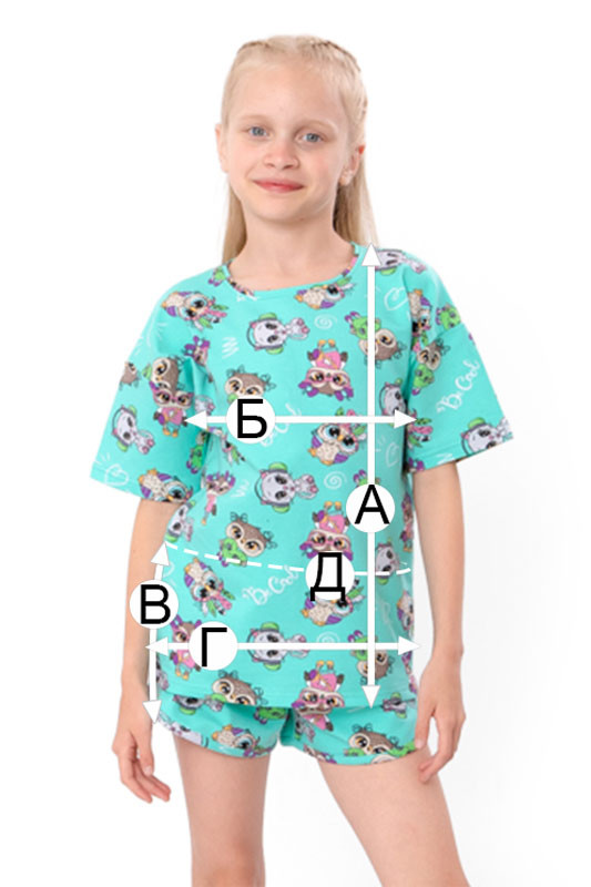 Шорти мають середню довжину та комфортну посадку. М’яка резинка на поясі надійно фіксує виріб, не перетискаючи животик, а вільний крій забезпечує свободу рухів. Вони виготовлені з того самого матеріалу, що й футболка, тому комплект виглядає гармонійно й стильно.