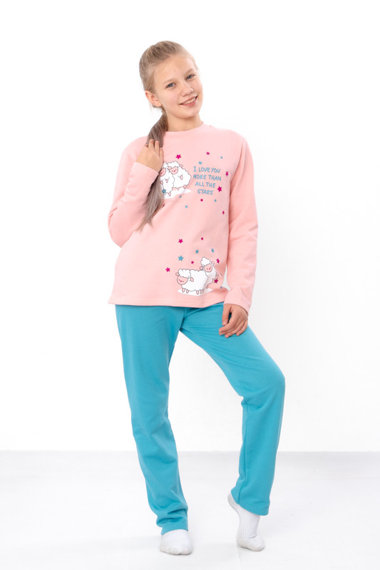 Тепла та комфортна піжама для дівчаток-підлітків, пошита з однотонного начосу. Кофта прямого крою з округлою горловиною. Спереду прикрашена милим накатним малюнком, який обов'язково сподобається дівчатам. Штани прямого крою на резинці. В такій піжамі дитина буде тепло та затишно. Можна носити в якості домашнього одягу. Піжама пошита з трикотажного полотна - начосу. Це трикотажне полотно з футерною ниткою, яка утворює начісування з виворітного боку, завдяки цьому полотно має хороші теплоізолюючі властивості.