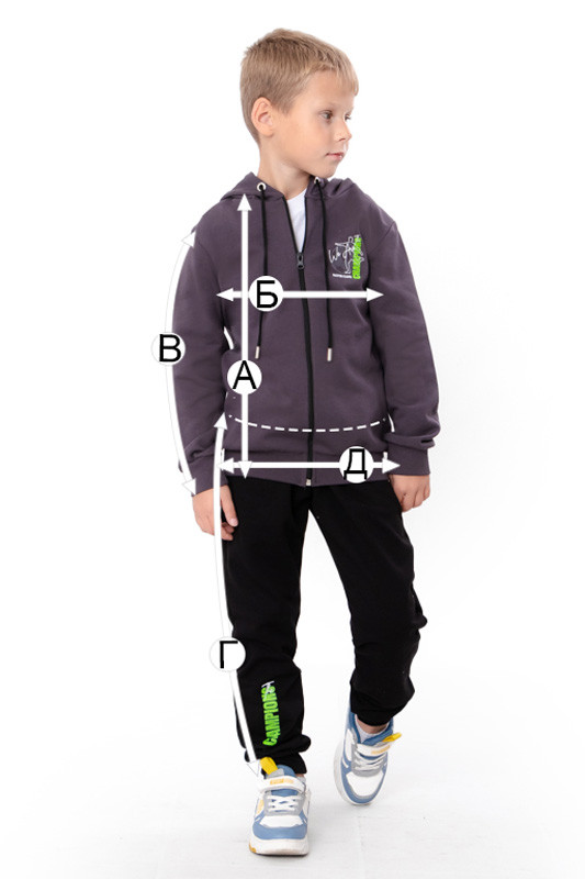 У дитячий спортивний костюм входять: кофта та штани. Модель виконана з однотонного начоса. Полотно сідає при пранні по довжині на 1-2 см. Рекомендується прати при температурі не більше 30 градусів. Кофта з капюшоном, на блискавці, доповнена декоративним шнурком. Штани на резинці, яка добре тягнеться, також, для зручності присутні кишені. На рукавах, знизу кофти і штанів стрейчеві манжети. Костюм прикрашений барвистим і якісним накатом. Модель ідеально підійде для прогулянок, занять спортом.