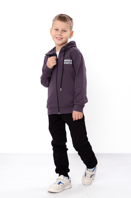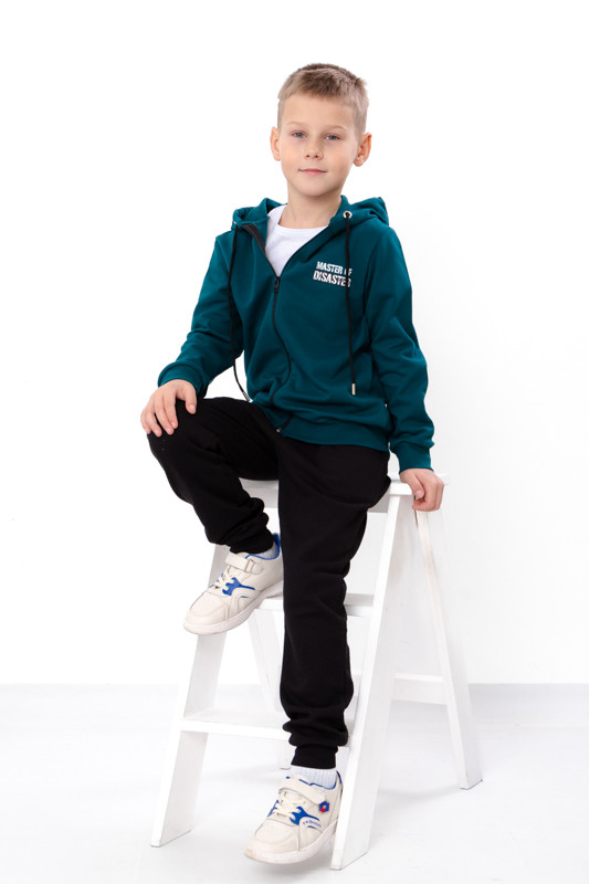 У дитячий спортивний костюм входять: кофта та штани. Модель виконана з однотонного начоса. Полотно сідає при пранні по довжині на 1-2 см. Рекомендується прати при температурі не більше 30 градусів. Кофта з капюшоном, на блискавці, доповнена декоративним шнурком. Штани на резинці, яка добре тягнеться, також, для зручності присутні кишені. На рукавах, знизу кофти і штанів стрейчеві манжети. Костюм прикрашений барвистим і якісним накатом. Модель ідеально підійде для прогулянок, занять спортом.