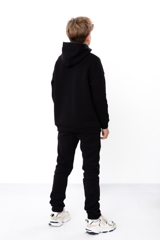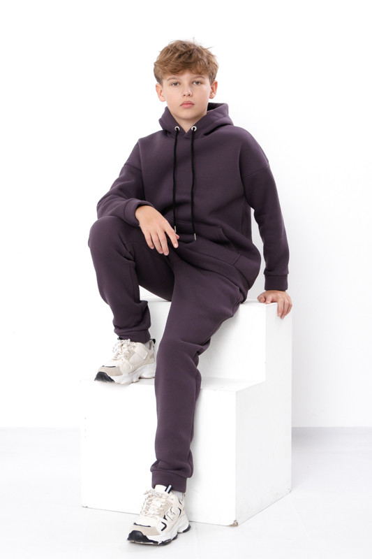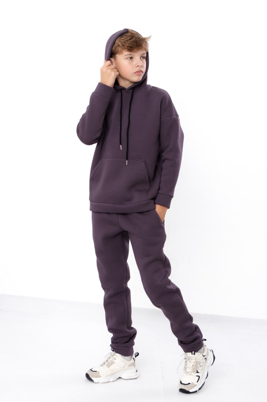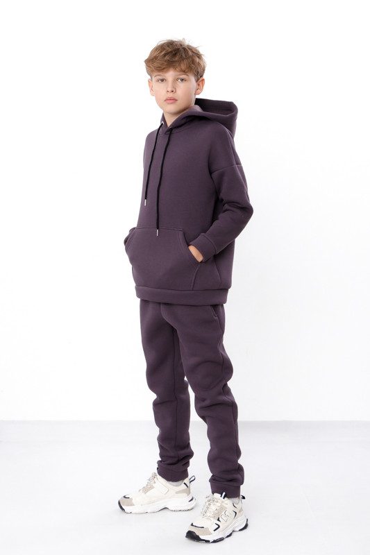 Базовий теплий костюм для хлопчика виконан з однотонної тринитки на начосі. Складається з худі та штанів. Худі з капюшоном, спереду є кишеня "кенгуру". Лінія плечей на рукавах спущена. Штани на широкій зручній резинці, по бокам є кишені. Костюм пошит в базових відтінках на будь-який смак. Такий костюм відмінно підходить на холодну погоду. Полотно щільне, має густий начіс з виворітної сторони, гарно зберігає тепло.