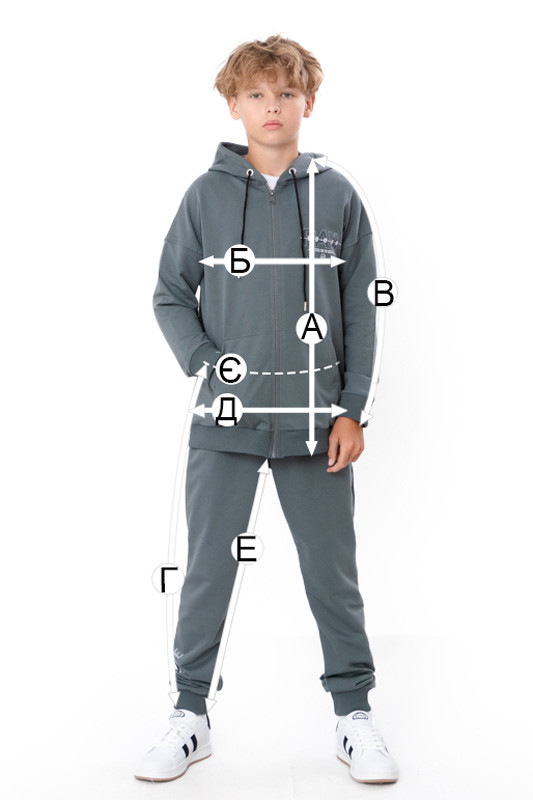 | Г - Довжина штанів по бічному шву, +/-2см | 86 | 89 | 93 | 96 | 99 |