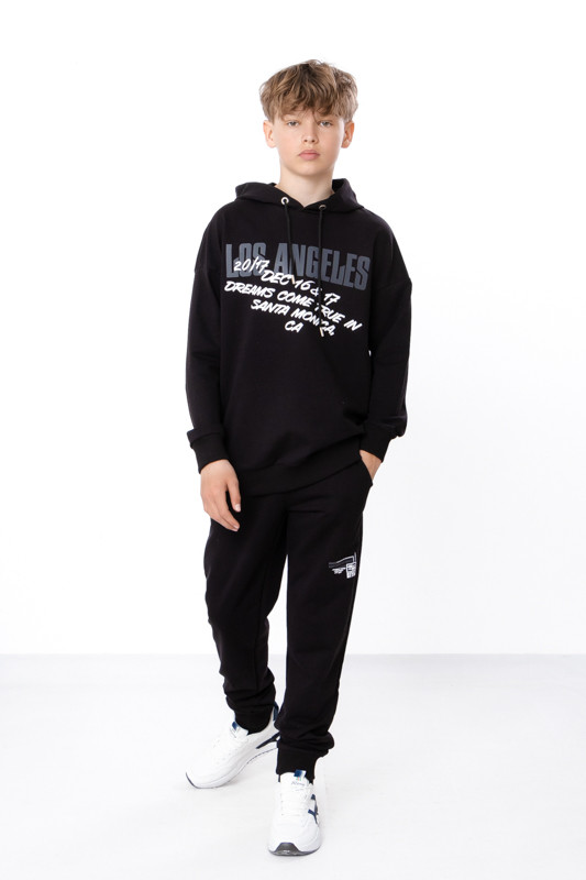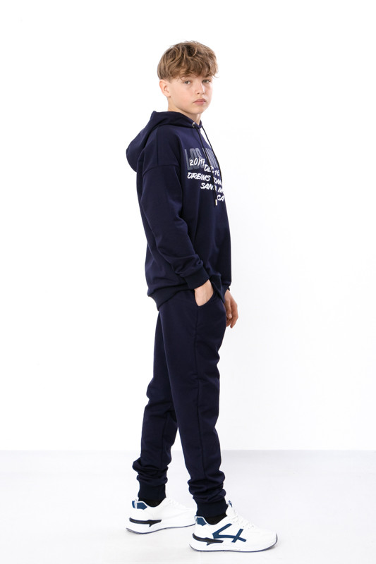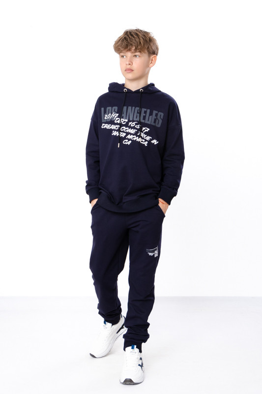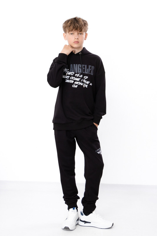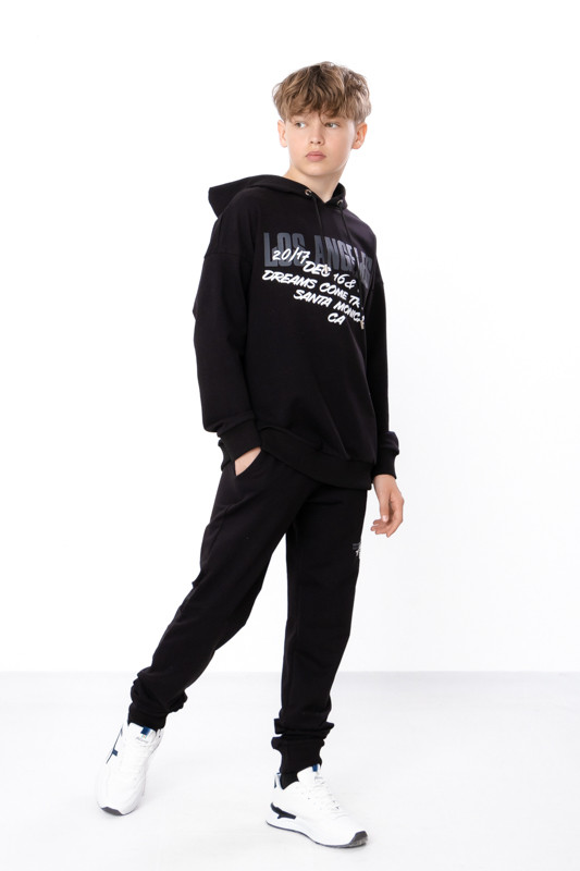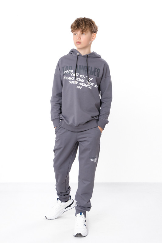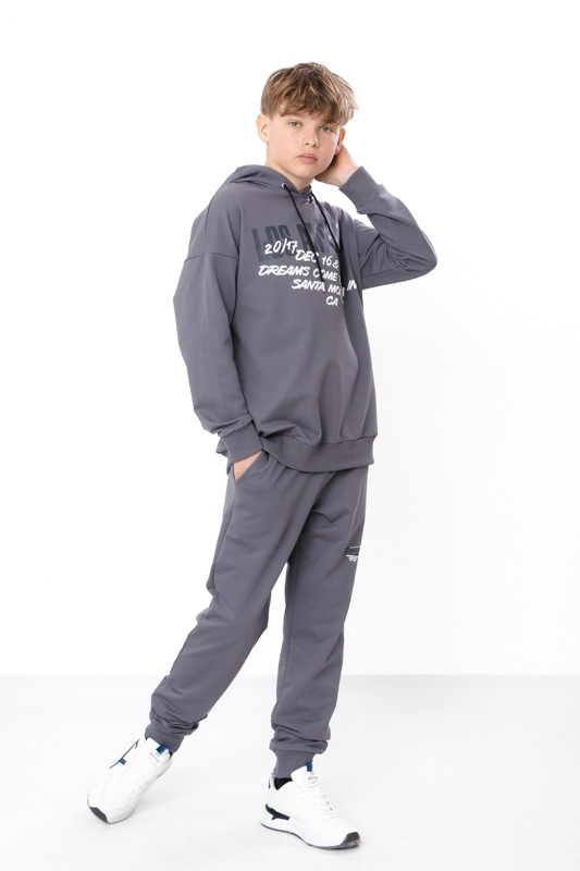 Костюм для хлопчика підлітковий пошит з однотонної двонитки. Костюм складається з худі та штанів. Худі з капюшоном, на рукавах та по низу широкі еластичні манжети. Штани на широкій зручній резинці, по бокам є дві кишені. На штанах та спереду на худі нанесений стильний накатний малюнок. Костюм можна доповнити кросівками або кедами. Підходить для повсякденного носіння, занять спортом або активних прогулянок. Полотно гарної якості. Тому, при правильному догляді, виріб можна буде носити не один сезон. Може давати усадку після прання.