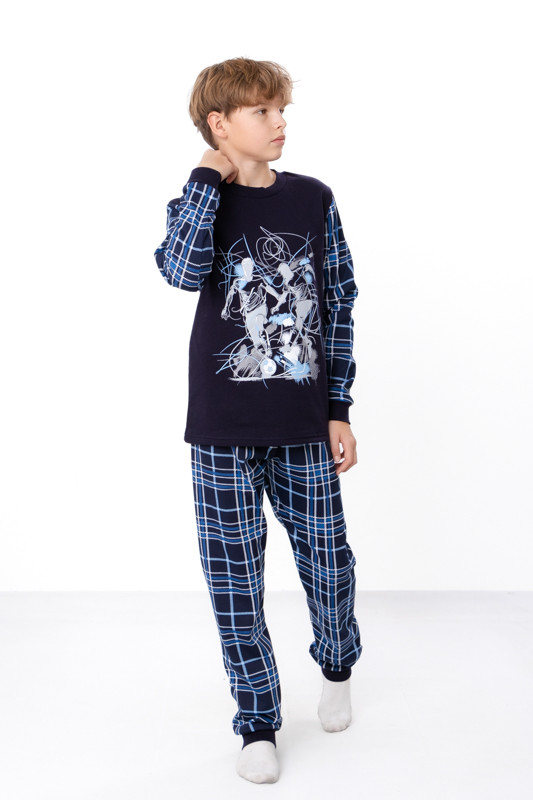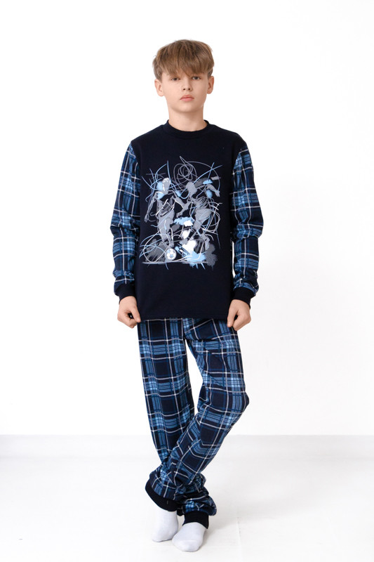Комплект складається з кофти та штанів. Верх виготовлений із принтованого начосу з оригінальним малюнком — він додає піжамі сучасного вигляду та сподобається хлопчикам, які люблять яскраві образи. Рукави й штани оздоблені тканиною в класичну клітинку темно-синього відтінку, що гармонійно поєднується з основним кольором кофти. Такий дизайн виглядає стильно та лаконічно, підкреслюючи індивідуальність дитини.