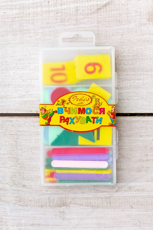 Цей набір для навчання математики включає звуковий математичний аналіз. Всі елементи набору зберігаються в пластиковому контейнері. Він містить пластикові цифри, математичні символи, 30 рахункових паличок та геометричні фігури: коло, ромб, квадрат, трикутник. Всі інструкції та описи надані українською мовою.