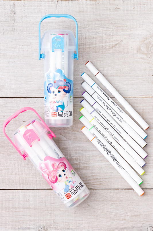 Цей набір включає двосторонні маркери для малювання, які можуть використовуватися у професійному малюнку або хобі, а також при створенні листівок або скрапбукінгу. Кожен маркер має два вузли, що пишуть: широкий кінчик, зрізаний під кутом, і еластичний пензлик. Чорнило маркерів на водяній основі.