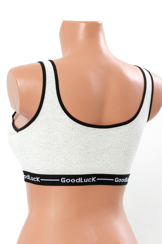 Бавовняний топик у рубчик з поролоновими вкладишами, на широких бретелях. Внизу комфортна контрастна гумка, по контуру окантовка