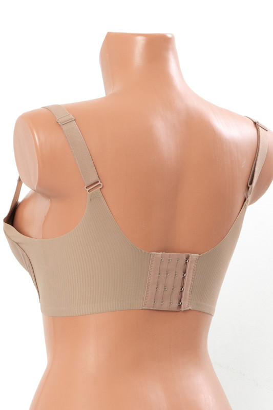 Формований бюстгальтер у рубчик без кісточок на широких бретелях. Спинка широка із застібкою на чотири гачки, бретелі не знімаються.