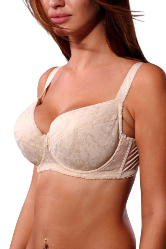 Бюстгальтер: мереживний, класичний. Тип чашок: повнорозмірні чашки. Наповнювач чашки тонкий поролон. Шви на чашках: діагональні шви. Кісточки: так. Перемичка: широка. Бічні частини ліфа: середня. Застібка: ззаду на два гачки. Бретельки: середні, незнімні.