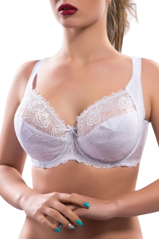 Бюстгальтер: мереживний. Тип чашок: повнорозмірні чашки з підкладкою. Наповнювач чашки: без поролону. Шви на чашках: діагональні шви. Кісточки: так. Перемичка: широка. Бічні частини ліфа: середня. Застібка: ззаду на два гачки. Бретельки: широкі, незнімні.