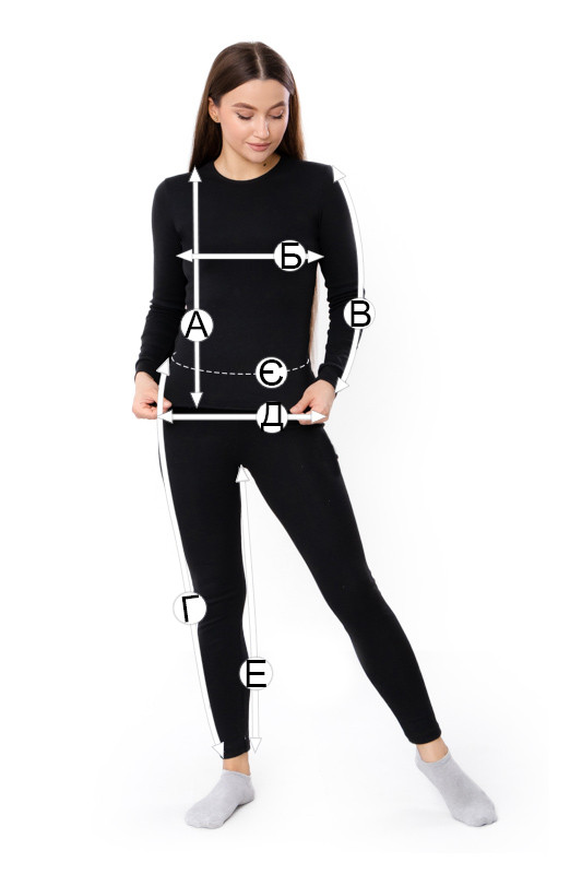 | Г - Довжина лосин по бічному шву, +/-2см | 98 | 98 | 98 | 99 | 99 | 100 |