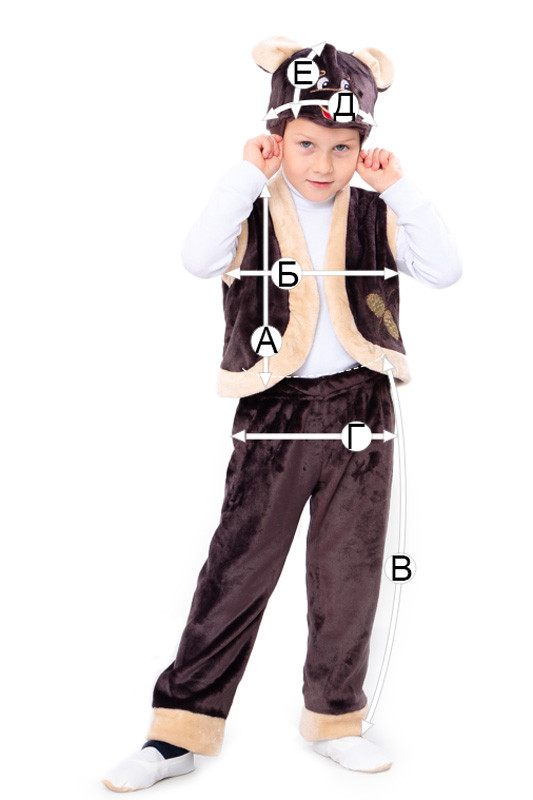 Новорічний костюм «Ведмедик» для хлопчиків неймовірно милий. Штани на резинці, жилет декорований опушкою, шапочка у вигляді мордочки ведмедика з вушками. У ньому ваш малюк почуватиметься цілком затишно, і гратиметься на святі без втоми.