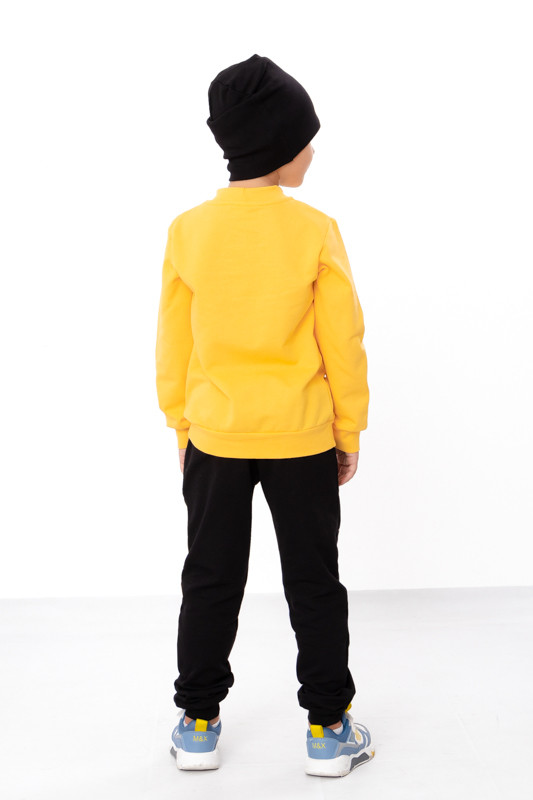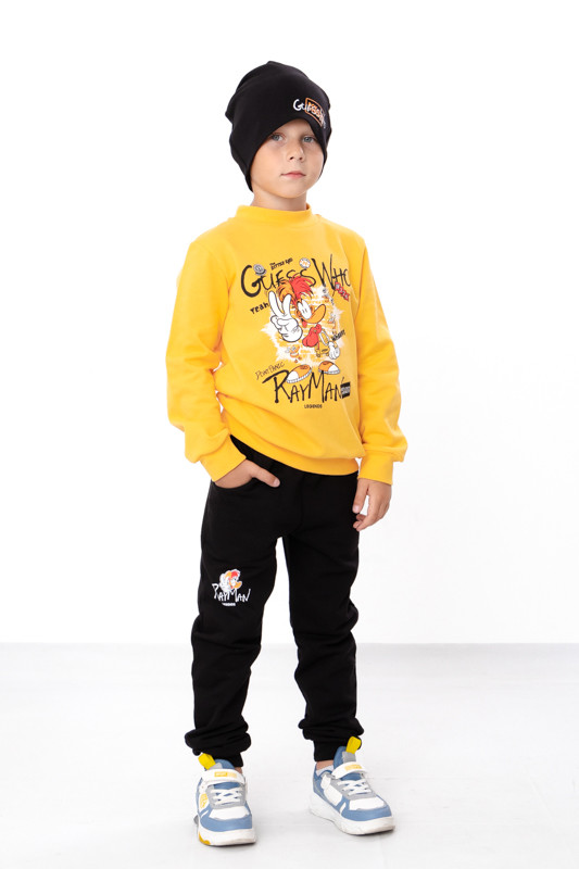 Костюм для хлопчика складається з яскравого світшота, зручних штанів та шапочки. Джемпер з довгими рукавами та круглою горловиною-стійкою. На рукавах та внизу широкі еластичні манжети. Спереду на джемпері нанесений стильний принт, який обов'язково сподобається хлопчикам. Штани прямого вільного крою, внизу на манжетах, з обох боків дві кишені. Штани та шапочка також декоровані накатним малюнком. Для пошиття використовувалося трикотажне полотно - однотонне начісування. Полотно добре утримує тепло та пропускає повітря.
