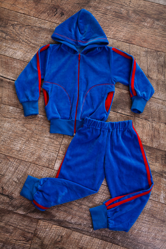Чудовий велюровий однотонний спортивний костюм для дівчаток. Модель з капюшоном на блискавці, доповнена кишенями з кольоровими, яскравими вставками. Виріб декорований подвійним лампасом на брюках і рукавах кофти. В костюмі використовується яскраве поєднання полотен.