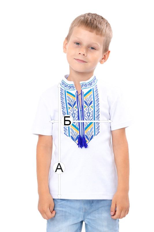 Вишиванка для хлопчиків з коротким рукавом, пошита з натурального трикотажного полотна - інтерлок. Дана модель прямого крою, має комір-стійку, перед вишиванки прикрашений вишитим орнаментом, доповнено китицями-зав'язками під колір вишивки. Виріб добре виглядає з брюками або джинсами. Ошатна і оригінальна вишиванка стане в нагоді на всі випадки життя.