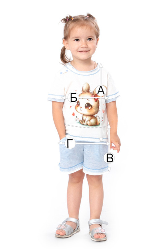 Комплект ясельний для дівчаток складається з футболки та шортиків. Пошитий з натурального бавовняного полотна – однотонний кулір, яке не викликає подразнень на шкірі малюка. Футболочка має круглу горловину, спереду нанесений милий принт зайченятка. Шортики на резинці, по бокам є дві кишені. Полотно гарної якості, після прання не линяє і не розтягується. Чудово підходить для щоденного використання в теплу погоду.