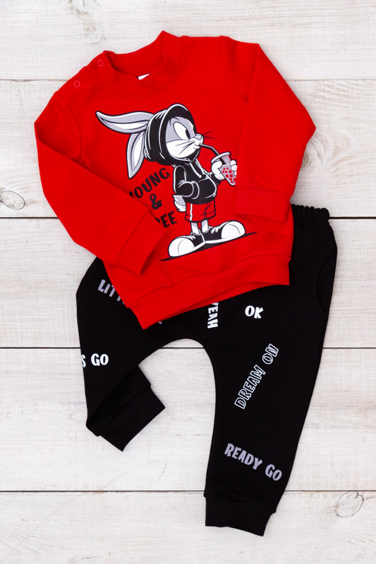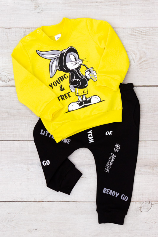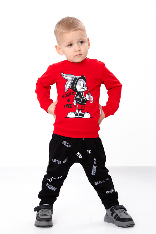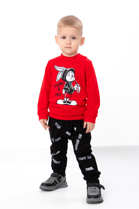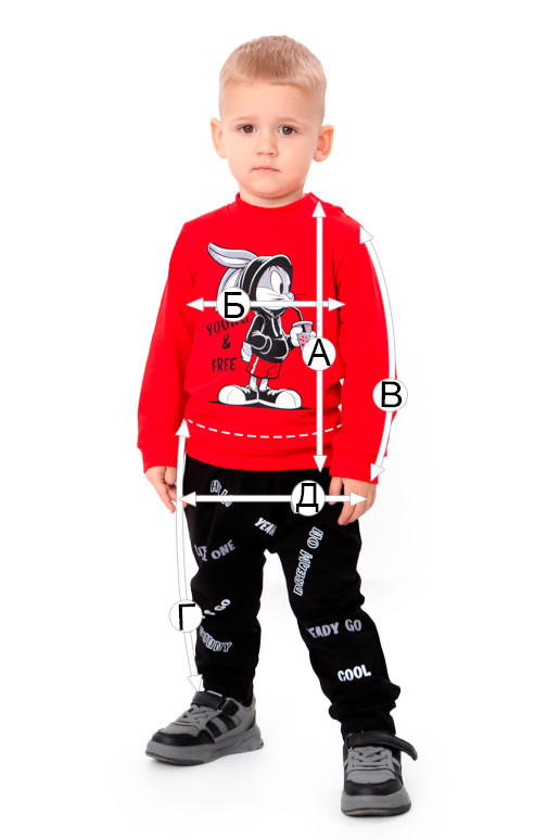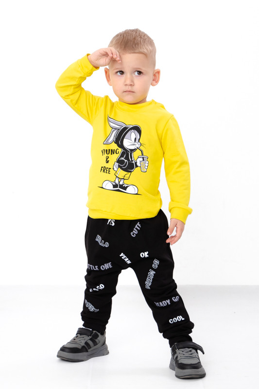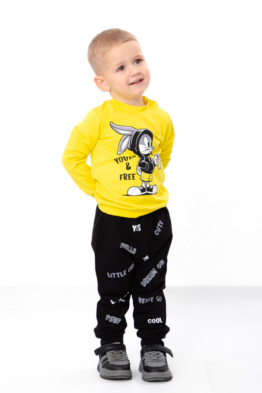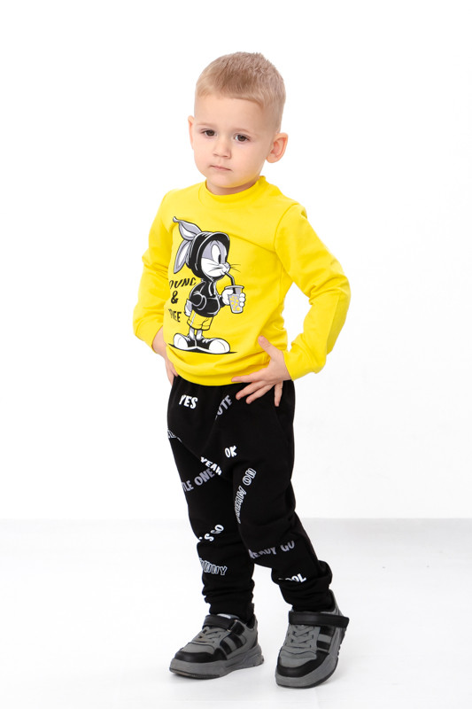 Штани комплекту мають стильний принт, що доповнює образ, додаючи кольору та настрою. Гумка на поясі дозволяє зручно регулювати посадку, не викликаючи дискомфорту, а практичний матеріал забезпечує свободу рухів під час ігор і активних занять. Крій штанів є класичним і універсальним, що дозволяє дітям рухатись без обмежень, а також гарантує комфорт і зручність протягом усього дня.