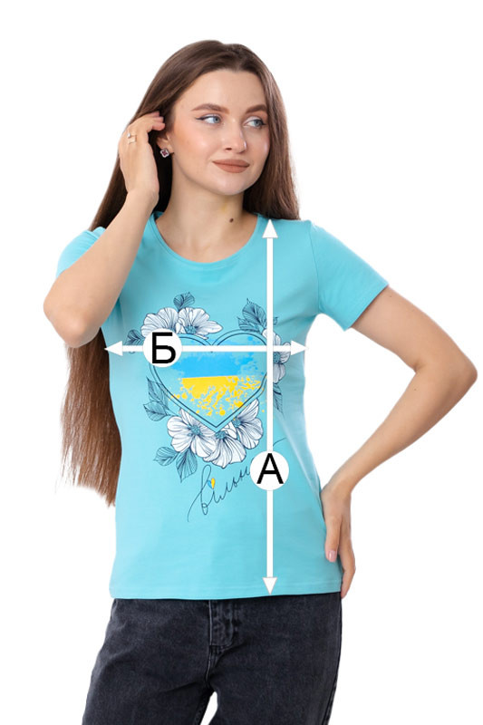 Футболка жіноча з коротким рукавом, пошита з натурального трикотажного полотна – фулікра. Має класичний прямий крій з округлою горловиною. Спереду нанесений накатний малюнок в патріотичній тематиці. Чудово поєднується з джинсами, шортами або спідницею.