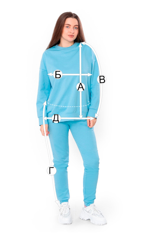 Жіночий костюм з однотонної двонитки складається зі світшоту та штанів. Світшот має округлу горловину, широкі еластичні манжети на рукавах та по низу. Штани трохи завужені до низу, з бічними кишенями по боках, пояс на широкій зручній резинці, манжети також на резинці. Полотно гарної якості. Тому, при правильному догляді, його можна буде носити не один сезон. Може давати усадку після прання.