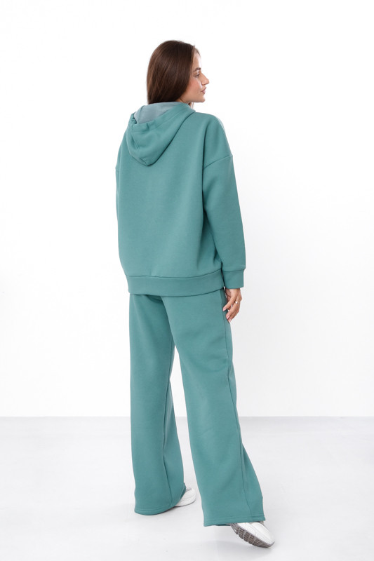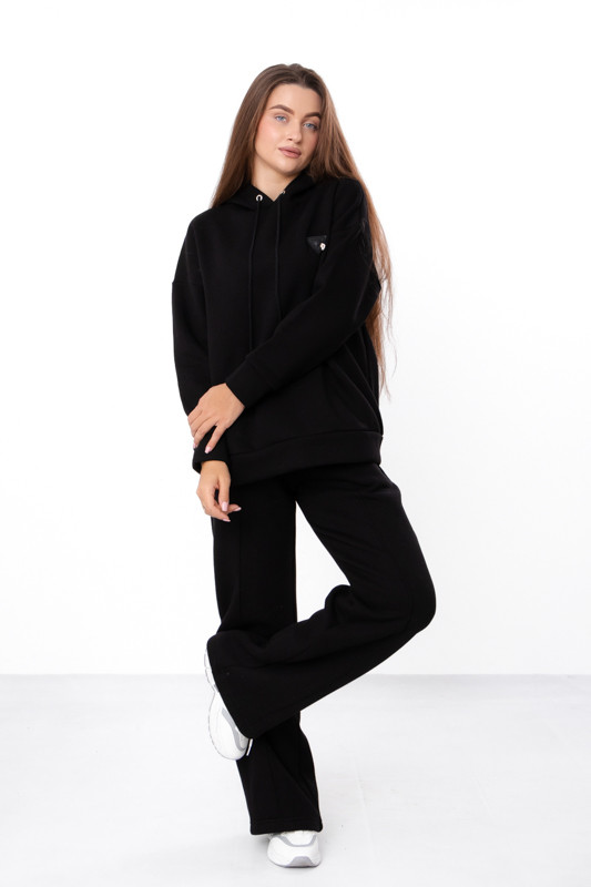 Худі з капюшоном, декорований нашивкою по переду виробу, рукава та низ на манжетах з основного полотна. Штани-палаццо з високою посадкою, зі стрілками по переду, мають дві кишені, широку резинку на поясі, для зручності в пояс вставлений шнурок.