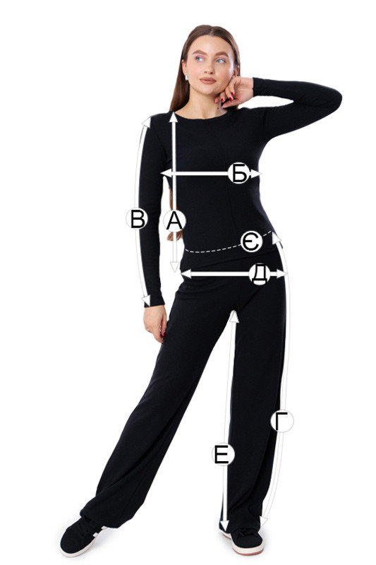 | Г - Довжина штанів по бічному шву, +/-2см | 102 | 103 | 103 | 103 | 103 | 103 |