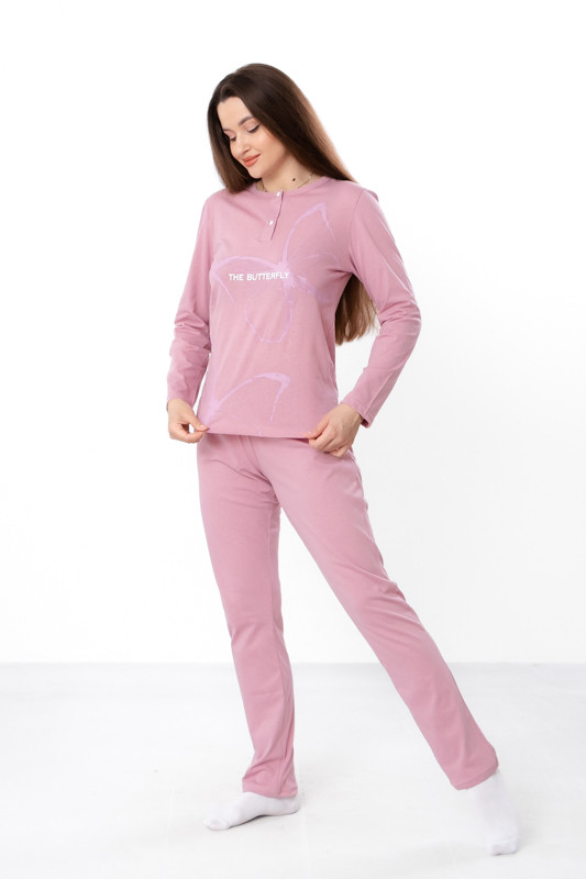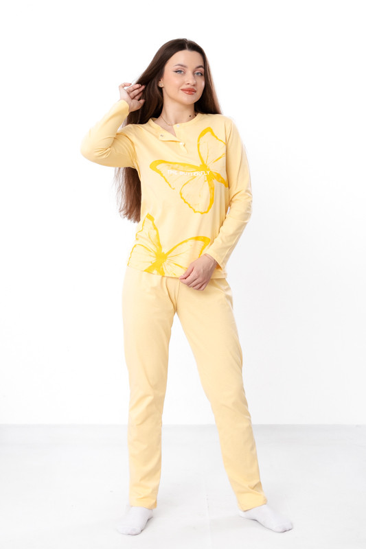 Ця піжама з куліру з накатом метеликів – не тільки зручна, але й надзвичайно стильна. Кнопки на воротнику додають витонченості, а без манжетів вона дарує свободу рухів і комфорт у будь-яку пору року.Ідеальний варіант для спокійних вечорів вдома.М'яка тканина дарує комфорт, а стильний дизайн додає вишуканості вашим вечорам.