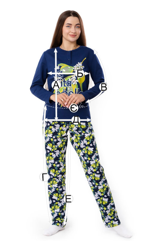 Жіноча піжама зі штанами виконана з якісної та м'якої 100% бавовни. Легке, ніжне полотно, що дихає, не скочується і не деформується при носінні. Затишна піжама складається з кофти з довгим рукавом та піжамних штанів. Зручні штани на гумці не обмежать руху навіть під час активної гри з дитиною чи прибирання. У цій піжамі ви виглядатимете гарно в домашній обстановці. Домашній одяг для жінок – річ, яку хочеться отримати у подарунок. Розмірна сітка містить великі розміри.