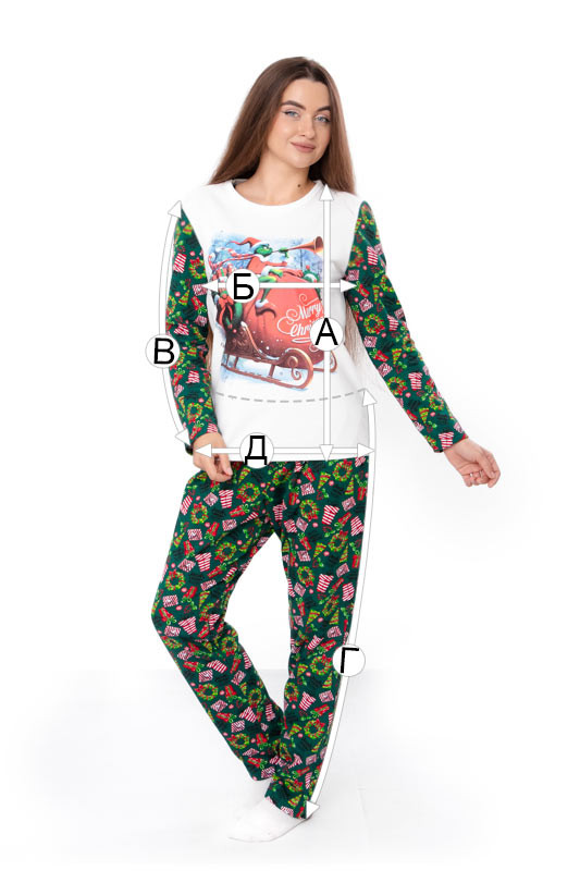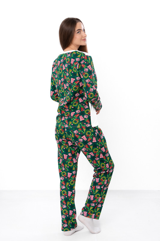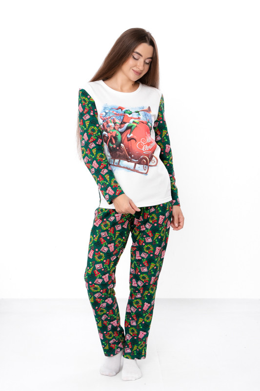 Модель складається з кофти та брюк. Верх виконаний у поєднанні білого кольору з яскравим принтом у новорічному стилі — святковий малюнок створює позитивний настрій і додає образу грайливості. Рукави та штани з принтованого начосу доповнюють композицію, утворюючи цілісний і гармонійний домашній look. Брюки мають комфортну посадку, м’яку резинку на талії, що забезпечує свободу рухів, і не утримують рух під час сну.